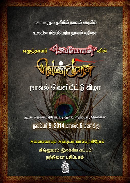 வெண்முரசு நூல்களான முதற்கனல், மழைப்பாடல், வண்ணக்கடல், நீலம் அறிமுகம்- வெளியீட்டு விழா வரும் நவம்பர் மாதம் 9 ஆம் தேதி ஞாயிற்றுக்கிழமை மாலை சென்னையில் நடைபெறுகிறது.